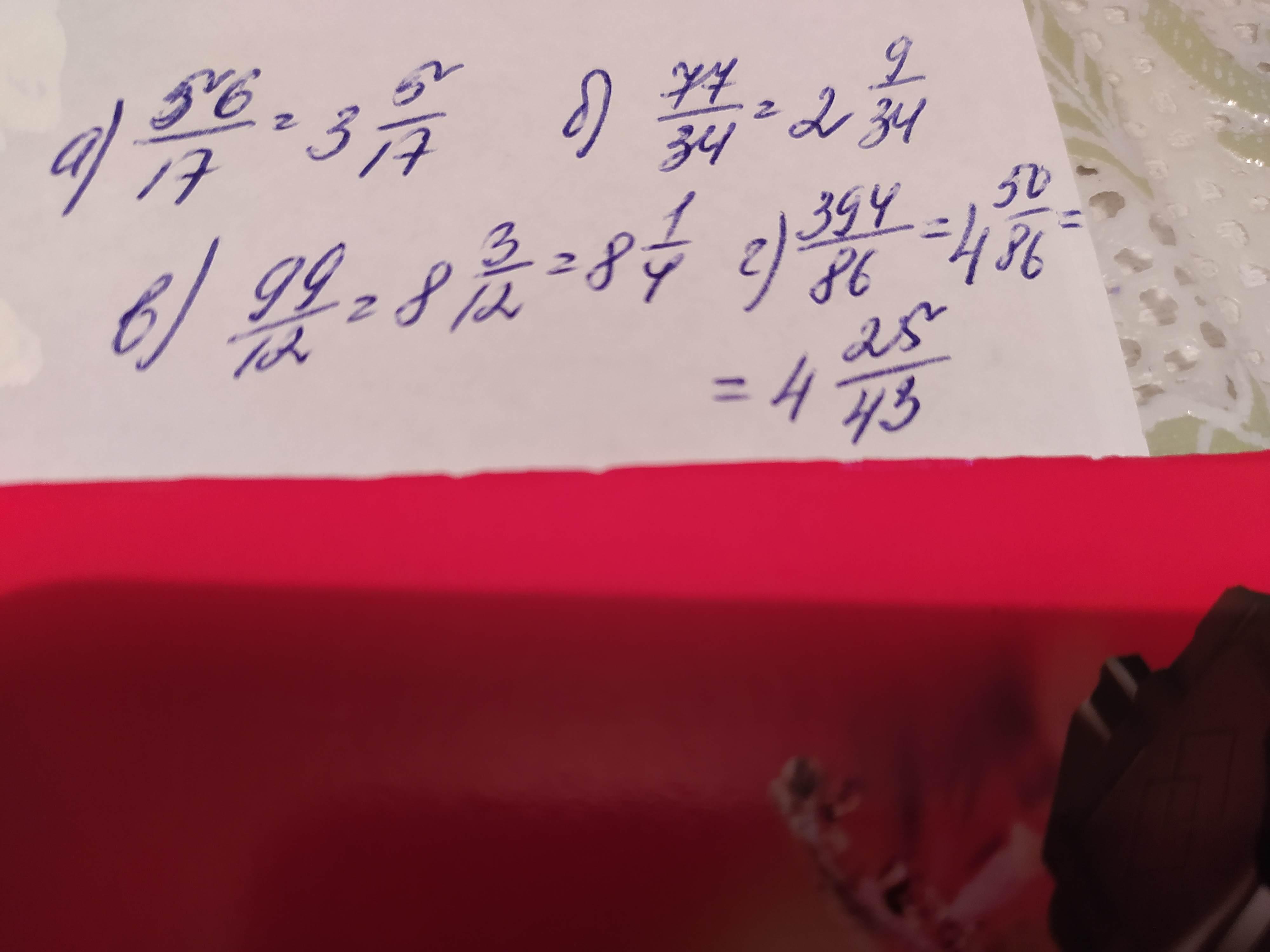 Запишите неправильные дроби в виде смешанного числа а) 56/17 б) 77/34 в)99/12 г)394/86.Помогите пж