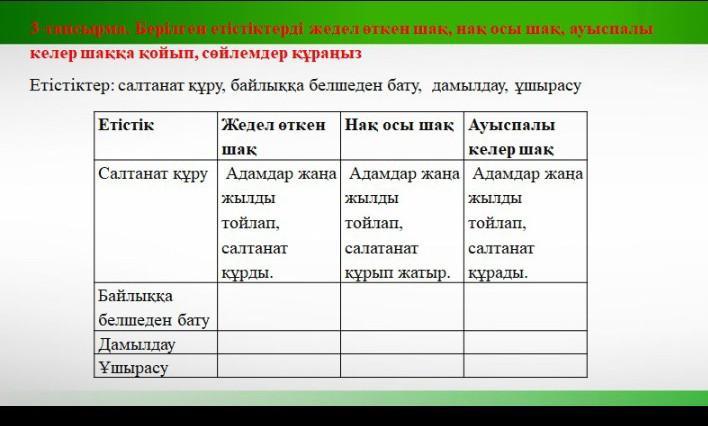 Нужно с словосочетаниями составить предложения. И это же предложения нужно образовать в жедел өткен шақ Нақ осы шақ и ауыспалы келер шақ