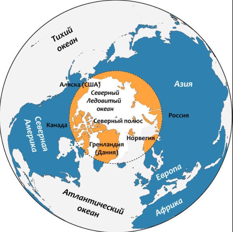 -положение относительно морей и океанов:Арктика расположена в районе Северного Ледовитого океана и близлежащий морей, расположенных севернее 70° с. ш.