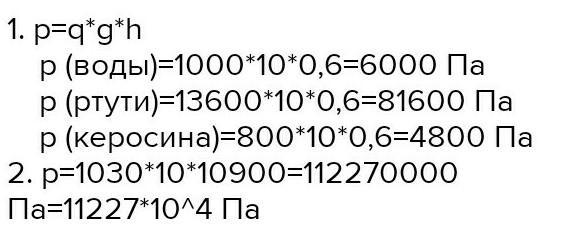 1. Определите давление на глубине 0,6 мв воде, керосине, ртути.