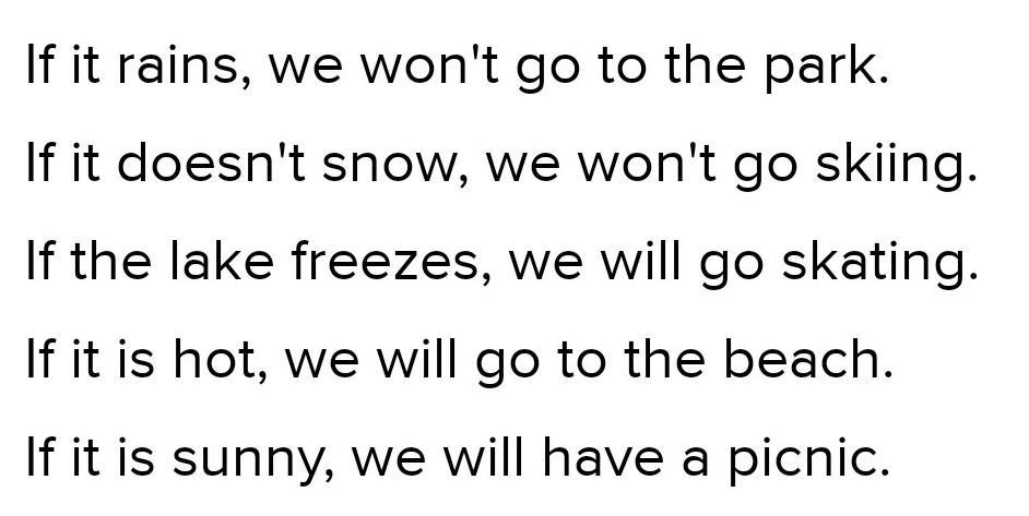 Если пойдет дождь, мы не пойдем в парк. Если не пойдет снег, мы не поедем кататься на лыжах. Если озеро замерзнет, мы пойдем кататься на коньках. Если будет жарко, мы пойдем на пляж. Если будет солнечно, мы устроим пикник