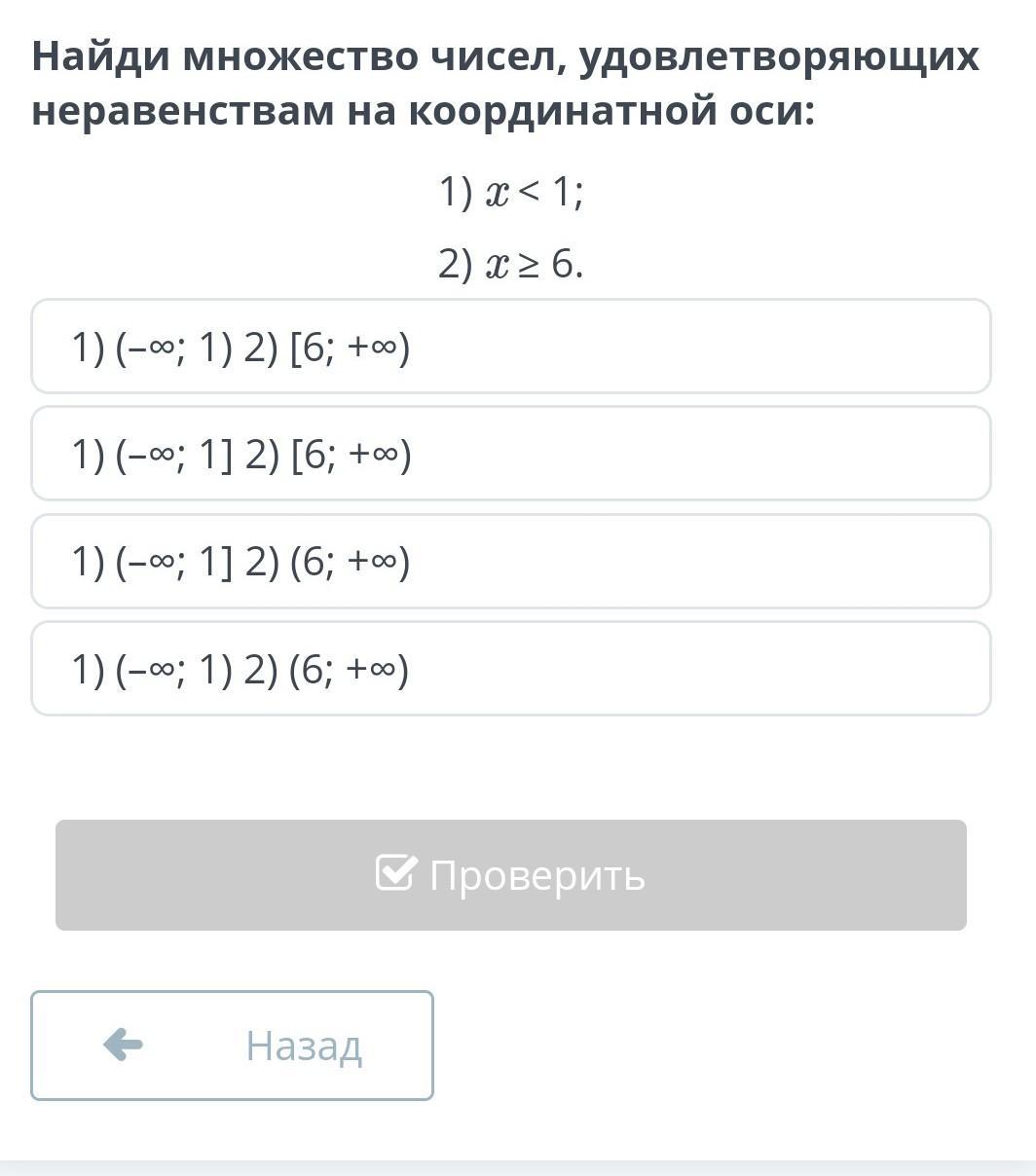 правильно будет 1) (-беск.; 1) 2) [6; +беск)