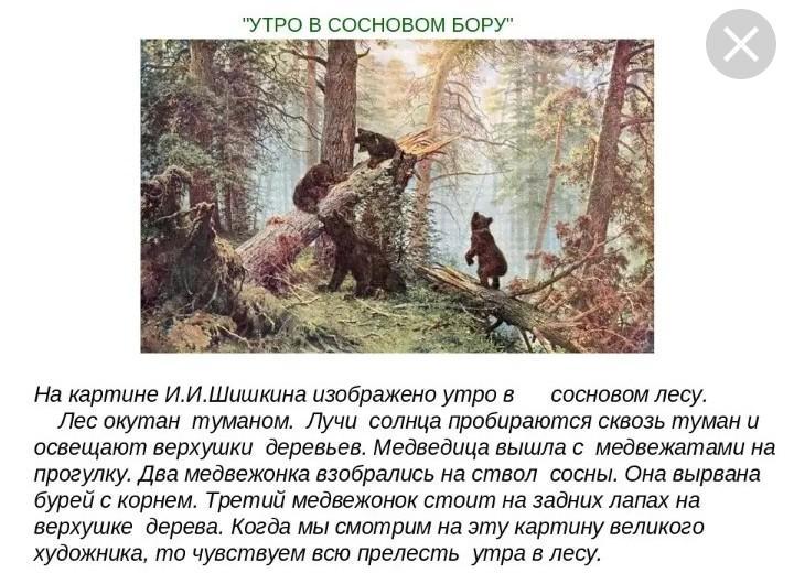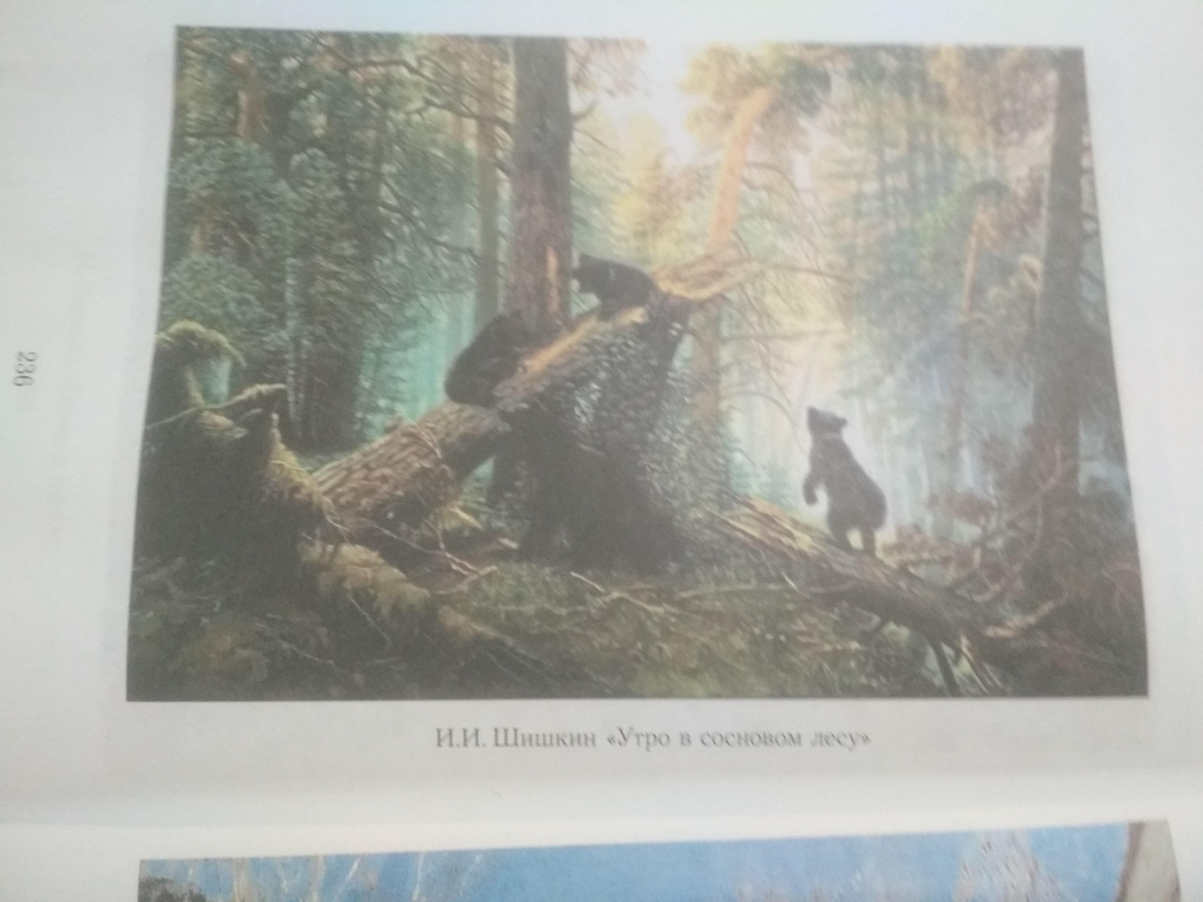 в центре картины стоит медведь на дереве и смотрит на небо сам медведь бело-бурый. с лева от центра два медведя который сидят на дереве . во сновном весь план картины занимают деревья. картина в не очень ярких тонах. мне эта картина очень нравится.