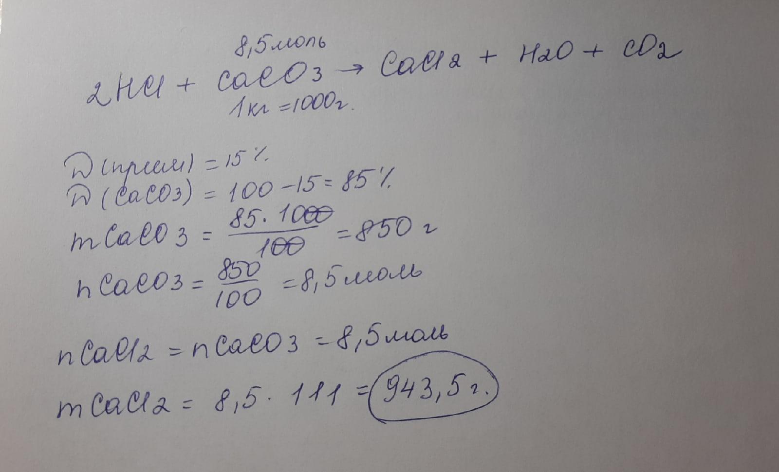 Рассчитайте массу соли, полученный при действии избытка соляной кислоты на 1 кг мрамора, содержащего 15% премисей.