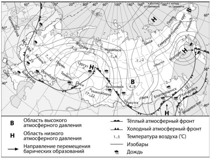 Карта погоды составлена на 27 апреля. В каком из перечисленных городов на следующий день наиболее вероятно существенное потепление?