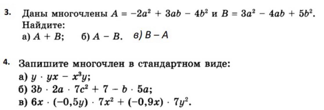 3в) B – A = (3a² – 4ab + 5b²) – (–2a² + 3ab – 4b²) = (3a² + 2a²) + (–4ab – 3ab) + (5b² + 4b²) = 5a² – 7ab + 9b²
