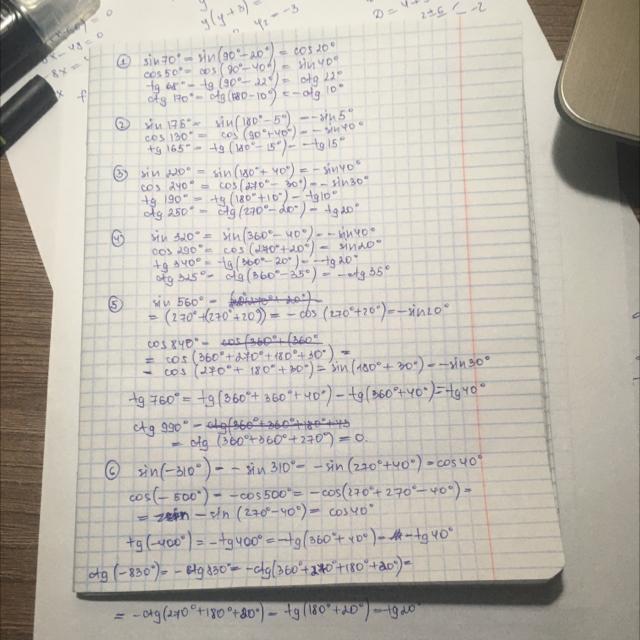 2) sin 175° , cos 130° , tg 165° , ctg 170° ; 3 ) sin 220° , cos 240° tg 190° , ctg 250° ; 4) sin 320 ° , cos 290 ° , tg 340° , ctg 325° ; 5) sin 560 ° , cos 840° , tg 760° , ctg 990° ; 6) sin (-310°) , cos(-500°) , tg(-400°) , ctg(-830°).