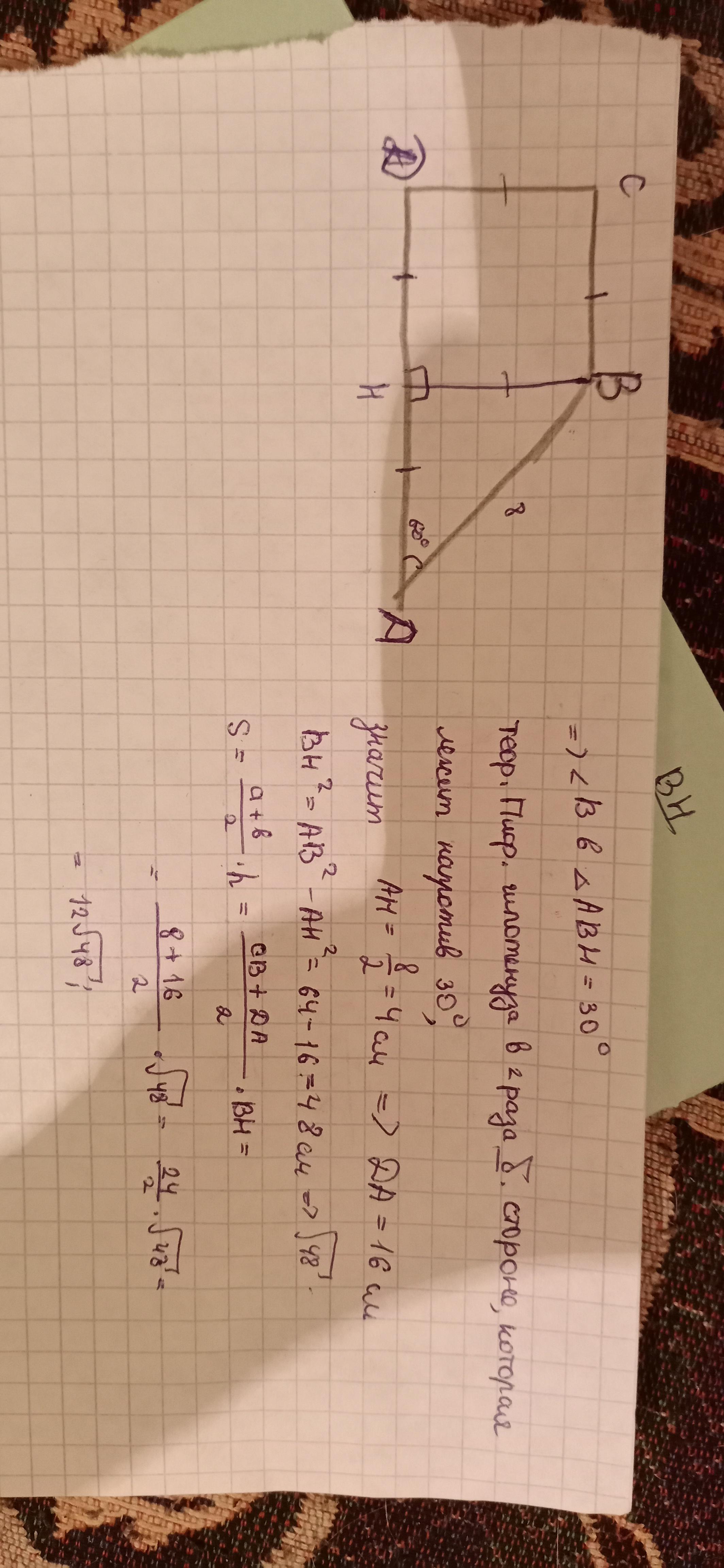 В прямоугольной трапеции ABCD большая боковая сторона равна 8 см., угол A равен 60°, а высота BH делит основание AD пополам. Найдите площадь трапеции. (Записать всё в виде задачи)