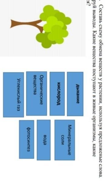 Задание 1. Составь схему обмена веществ у растении, используя предложеные слова. Сформулируй выводы. Какие вещества поступают в живые организмы, какие выделяются? дыхание Минеральные соли кислород вода Oрганические вещества фотосинтез Углекислый газ