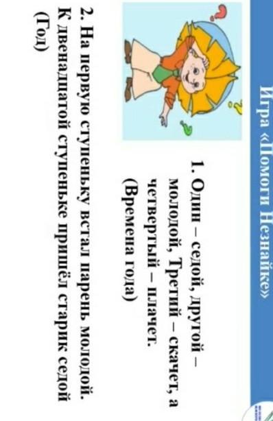 1. Один — седой, другой молодой, Третий - скачет, а четвертый —- плачет. (Времена года) 2. На первую ступеньку встал парень молодой. К двенадцатой ступеньке пришёл старик седой (Год) загадки и выпишите из них только числительные пж пж