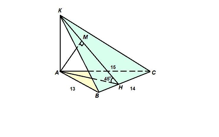 =13 см, AC = 15 см, ВС = 14 см, а кут між площиною ВСК і площи-
