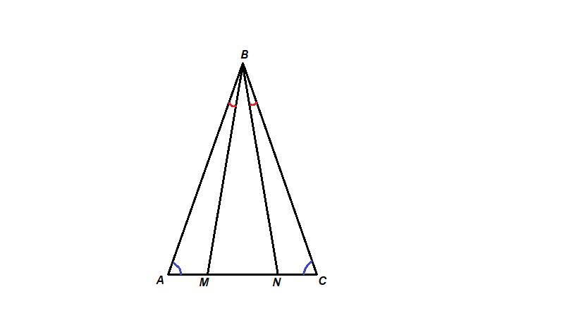 На стороне AC треугольника ABC отмечены точки M и N (M принадлежит AN). Известно, что угол BAC = углу BCA, угол ABM = euke NBC. Докажите что треугольник MBN равнобедренный.
