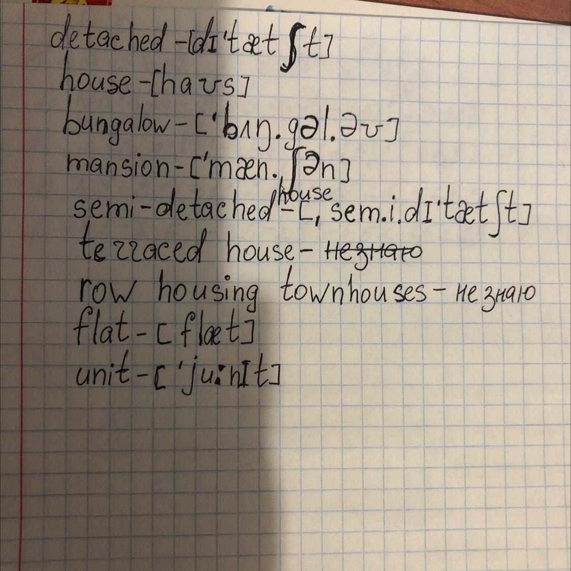 транскрипция слов detached house, bungalow, mansion, semi-detached house, terraced house, row housing townhouses, flat, apartment blck, apartment buiding, unit, ane-bedroom, two-bedroom, three-bedroom unit заранее спасибо