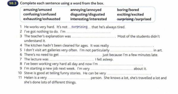bored, confusing, disgusting, interested, annoyed, boring, exhausted, excited, amusing, interesting