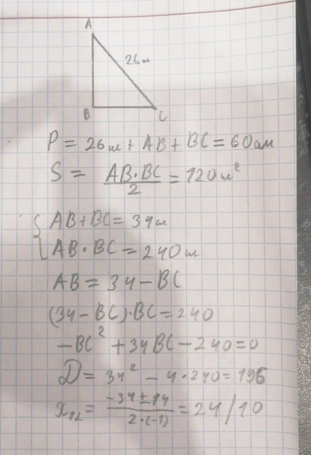 ПОМОГИТЕ! СРОЧНО! 40 БАЛЛОВ! Площадь прямоугольного треугольника равна 120cm2, а периметр - 60cm. Найти длину катетов треугольника, если длинна гипотенузы 26cm.