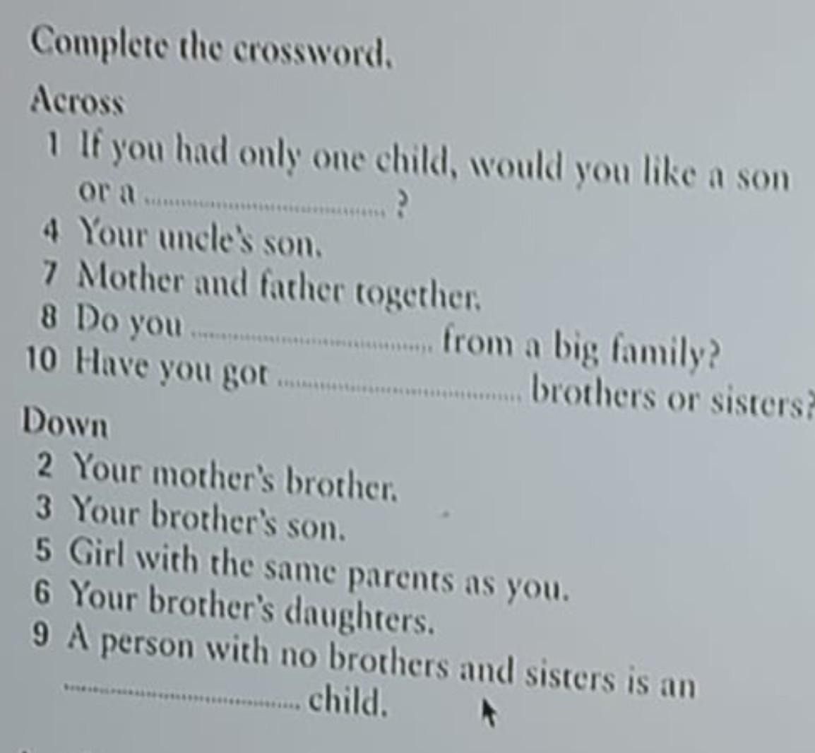 Complete the crossword. Across 1 If you had only one child, would you a son or a 4 Your uncle's son. 7 Mother and father together. 8 Do you 10 Have you got from a big family? brothers or sisters? Down 2 Your mother's brother. 3 Your brother's son. 5 Girl with the same parents 6 Your brother's daughters. 9 A person with no brothers and sisters is an child.