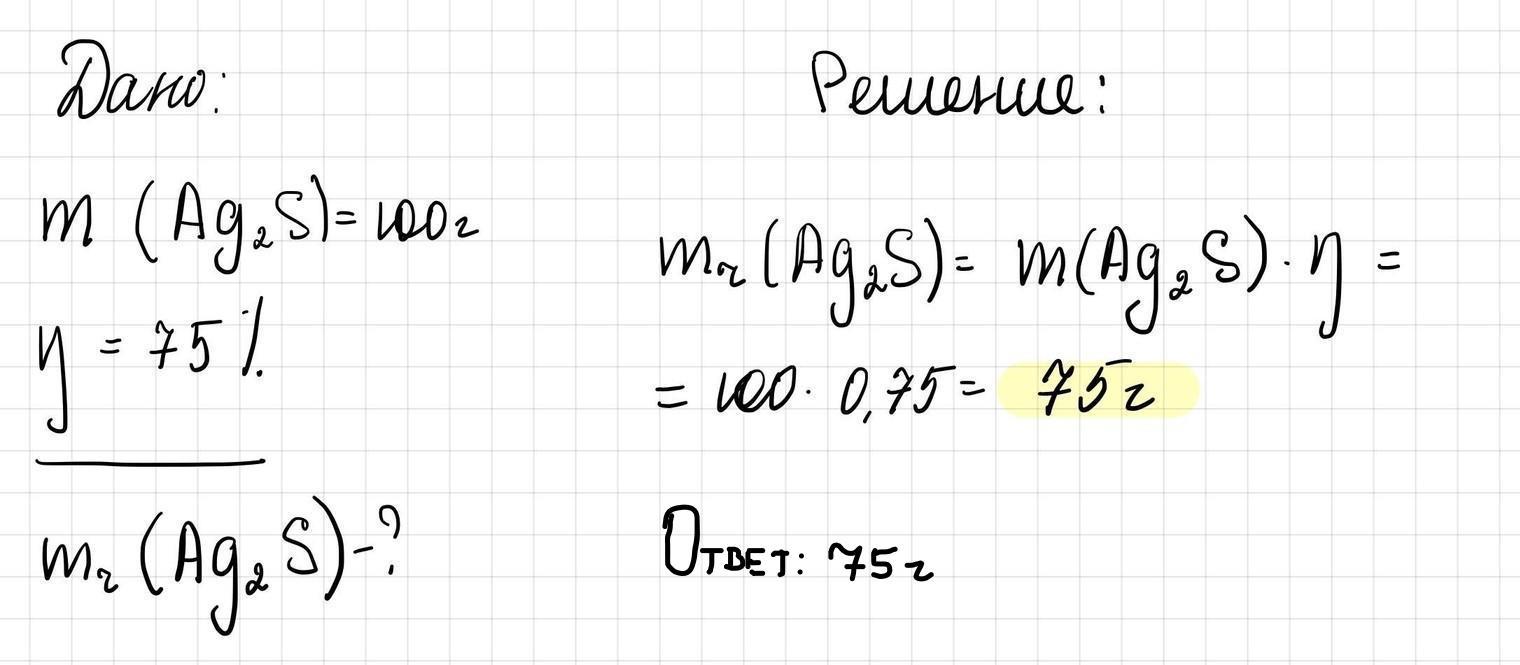 Из образца горной породы m=189 г, содержащего минерал Ag2S (аргентит) выделено чистого сульфида серебра (I) 75%. Найдите массу чистого сульфида серебра.