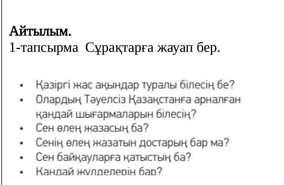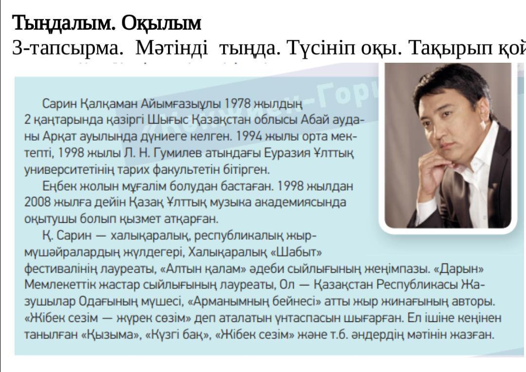 1)қазіргі ақындардың ішінен Қалқаман Сарин ағамыздың шығармашылығы өте қатты ұнайды!Әсіресе " Менің мұңым " атты өлеңі жаныма жақын.