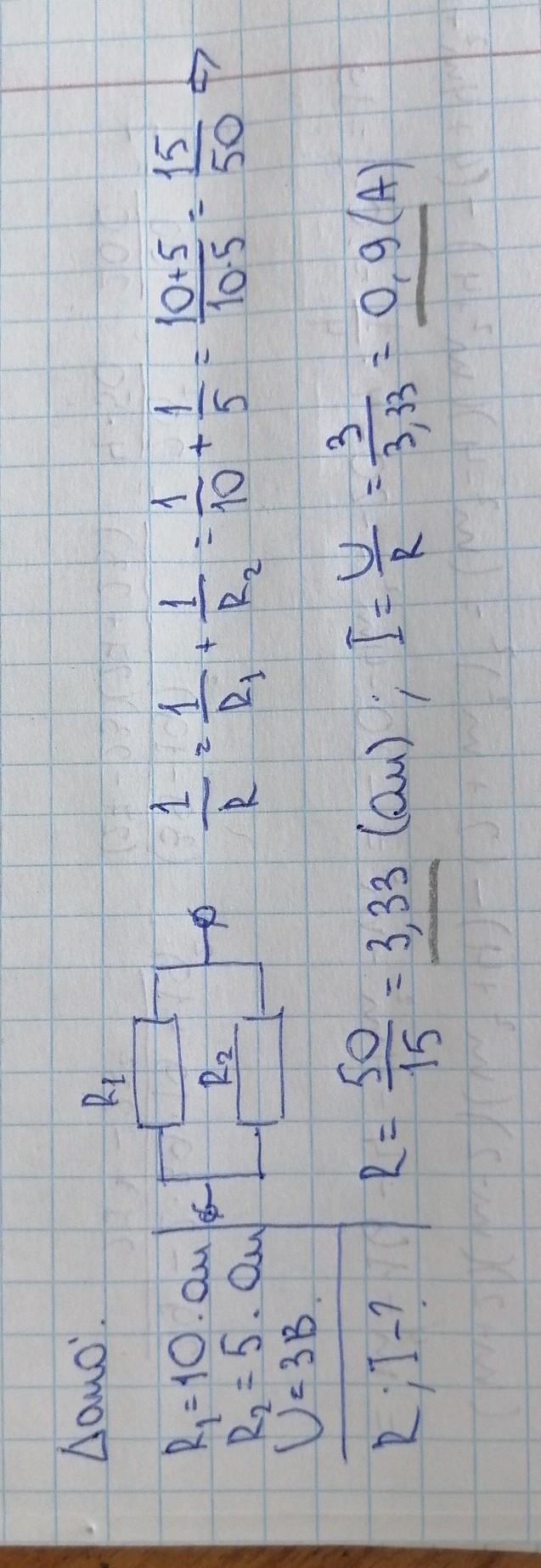 В цепь параллельно подключены резисторы, сопротивление которых 10 Ом и 5 Ом. Напряжение в цепи 3 В. Определите общее сопротивление и силу тока в цепи.