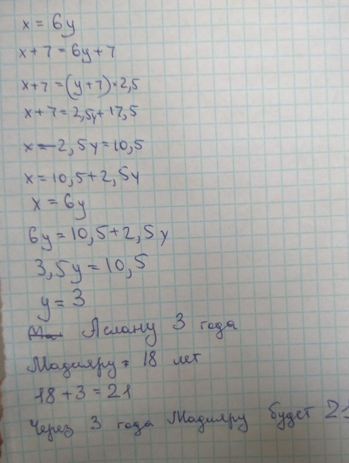 сейчас Мадияр в 6 раз старше Аслана, а через 7 лет он будет старше в 2,5 раза. Сколько лет будет Мадияру через 3 года?