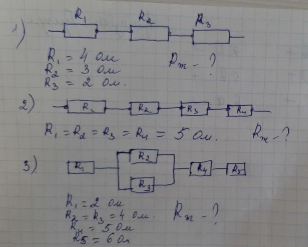 1) R=R1+R2+R3=4 Ом+3 Ом+2 Ом=9 Ом
