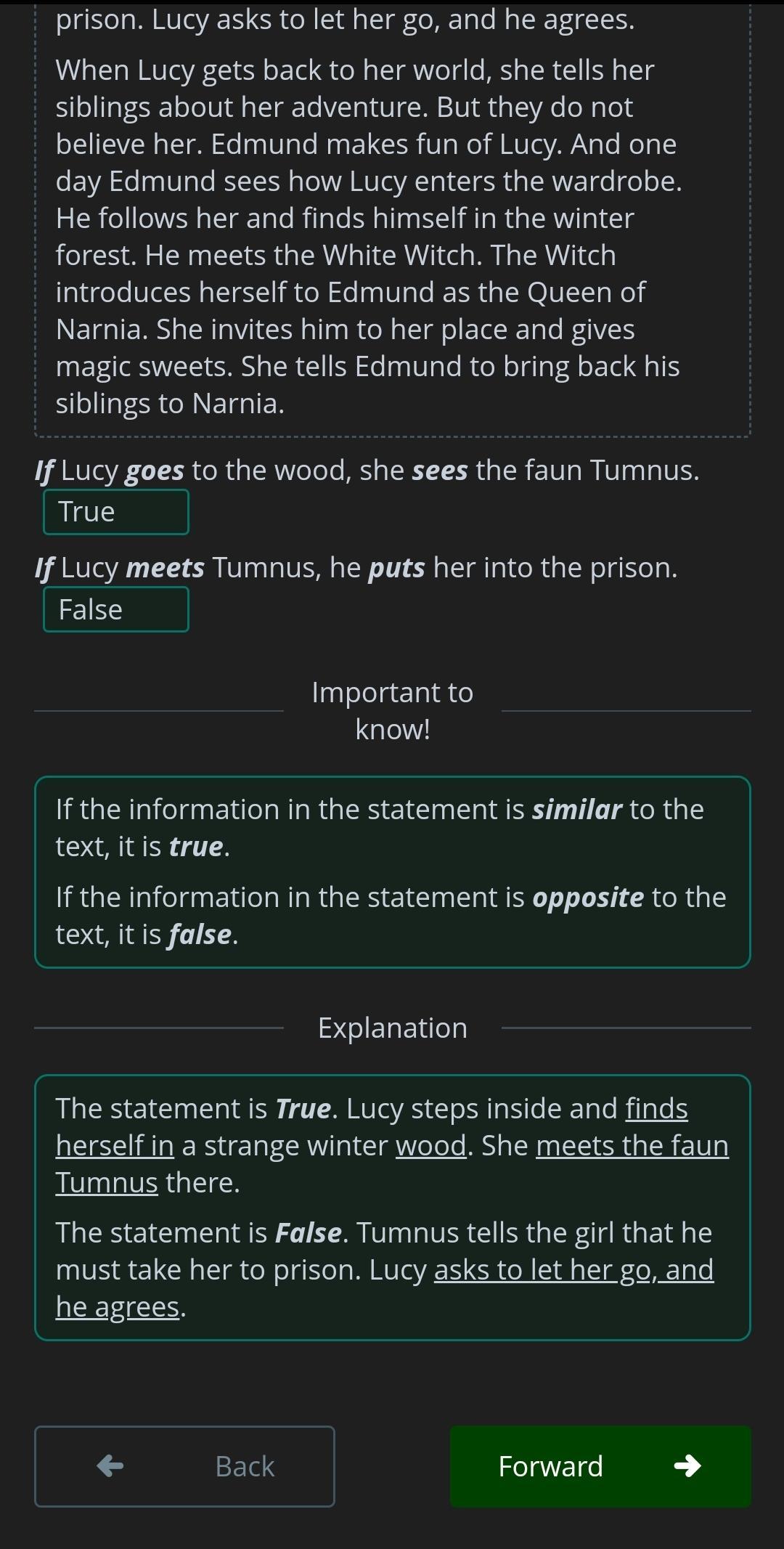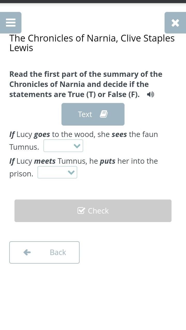 Read the first part of the summary of the Chronicles of Narnia and decide if the statements are True (T) or False (F).