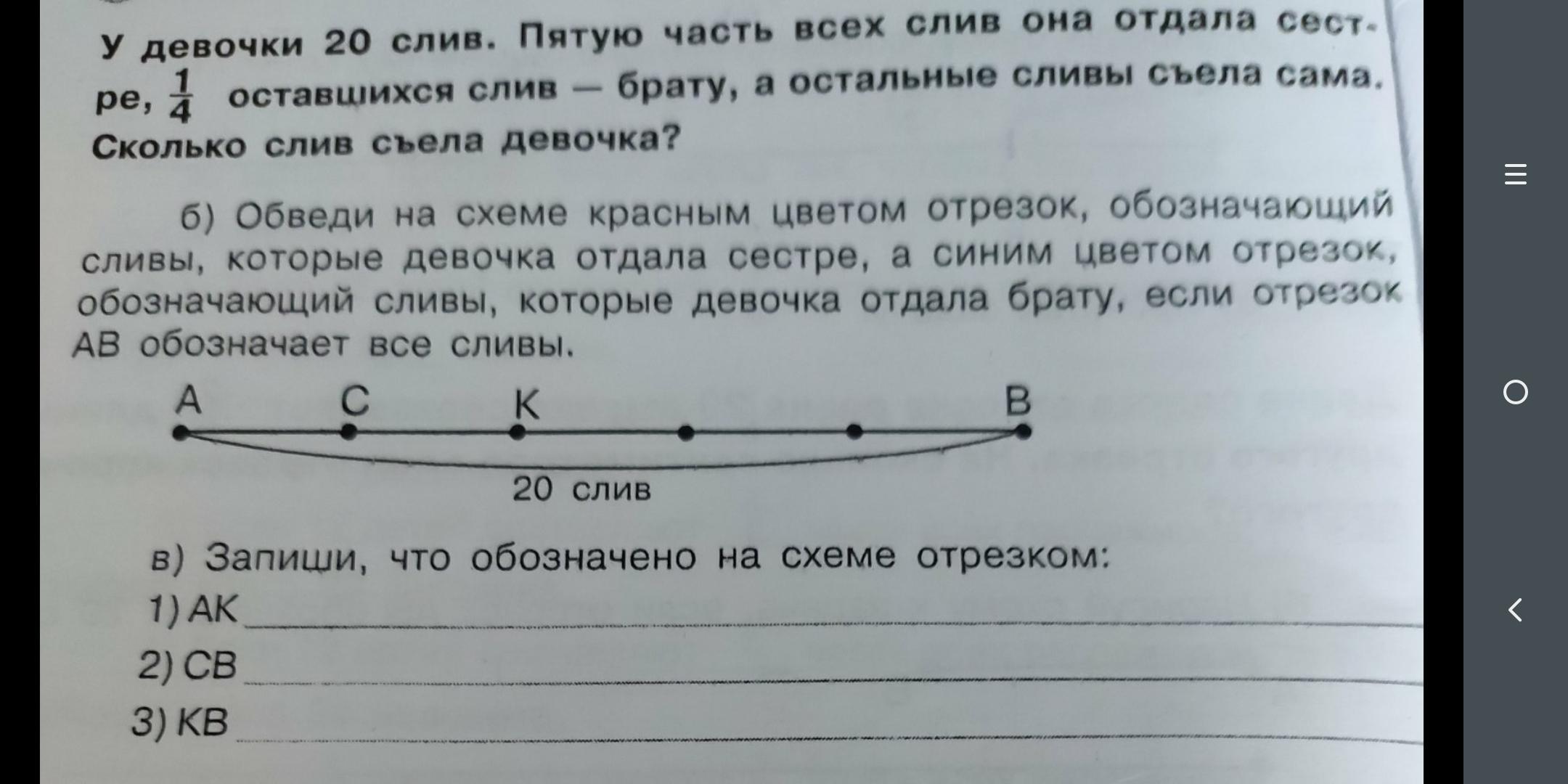 3) 12 слив села девочка сама. b) AC она отдала сестре. CK она отдала брату. KB она села сама. c) AK она отдала другим. CВ у нее осталось после того как она отдала часть сестре. КВ она села самаю