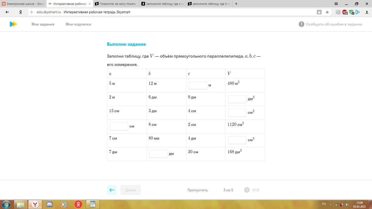 5. a = 7см, b = 80мм, с = 4дм, V = 2240