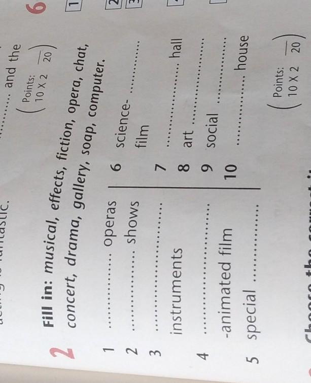Fill in: musical, effects, fiction, opera, chat, concert, drama, gallery, soap, computer. 6 science- operas shows **....... film hall 3 8. art 9 social instruments 4. -animated film house 5 special Points: помогите плиз