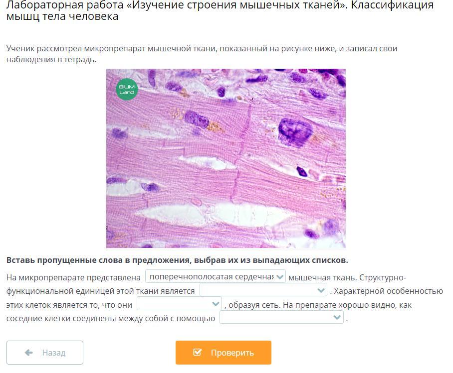 На микропрепарате представлена поперечно-полосатая сердечная ткань. Структурно-функциональной единицей это ткани является кардиомиоцит. Характерной особенностью этих клеток является то, что они разветвляются и анастамозируют, образуя сеть. На препарате хорошо видно, как соседние клетки соединены между собой с помощью вставочных дисков.