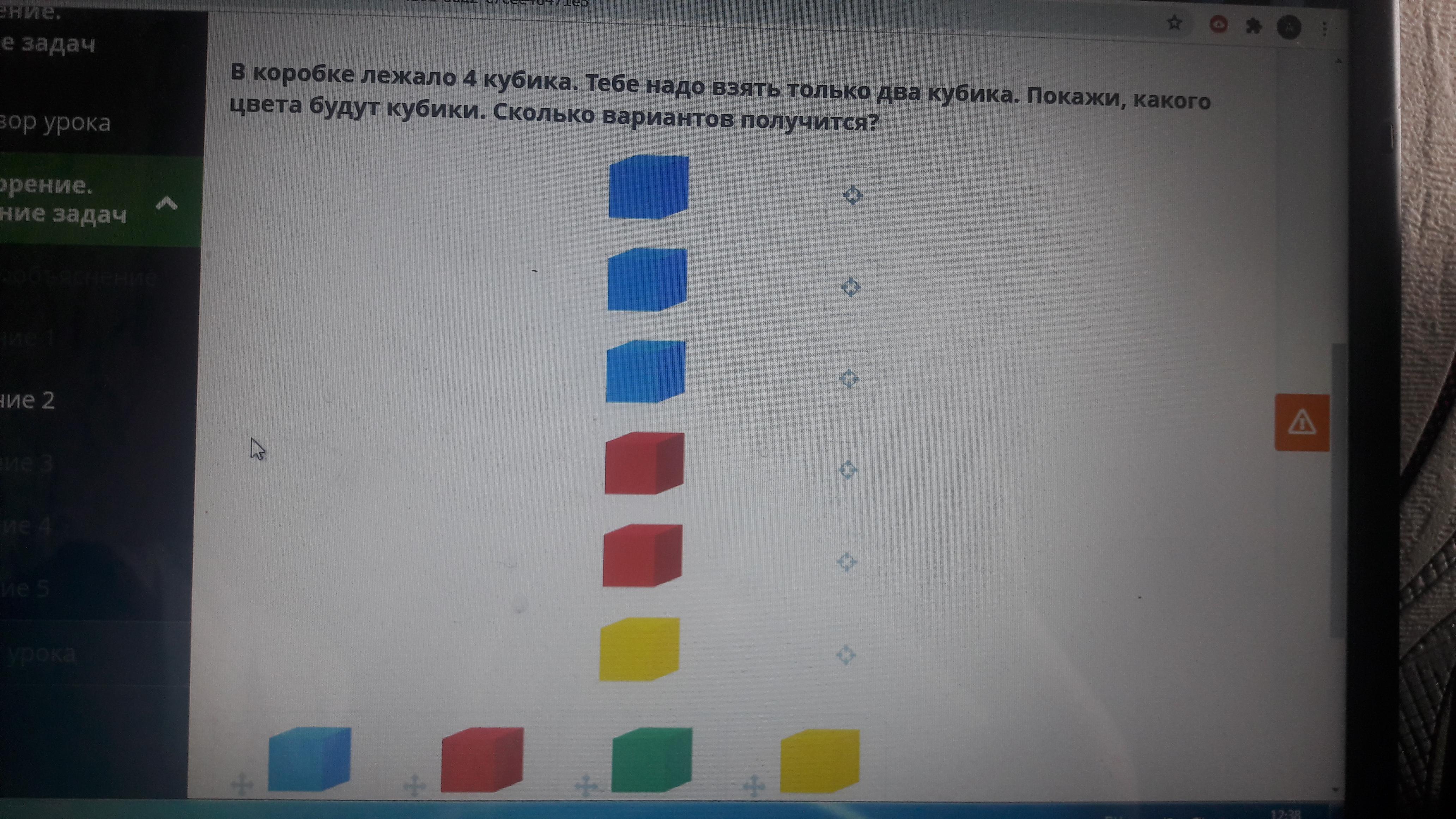 В коробке лежало 4 кубика тебе надо взять только 2 кубикаипокажи какого цвета будут кубики сколько вариантов получится сдаю 20 баллов