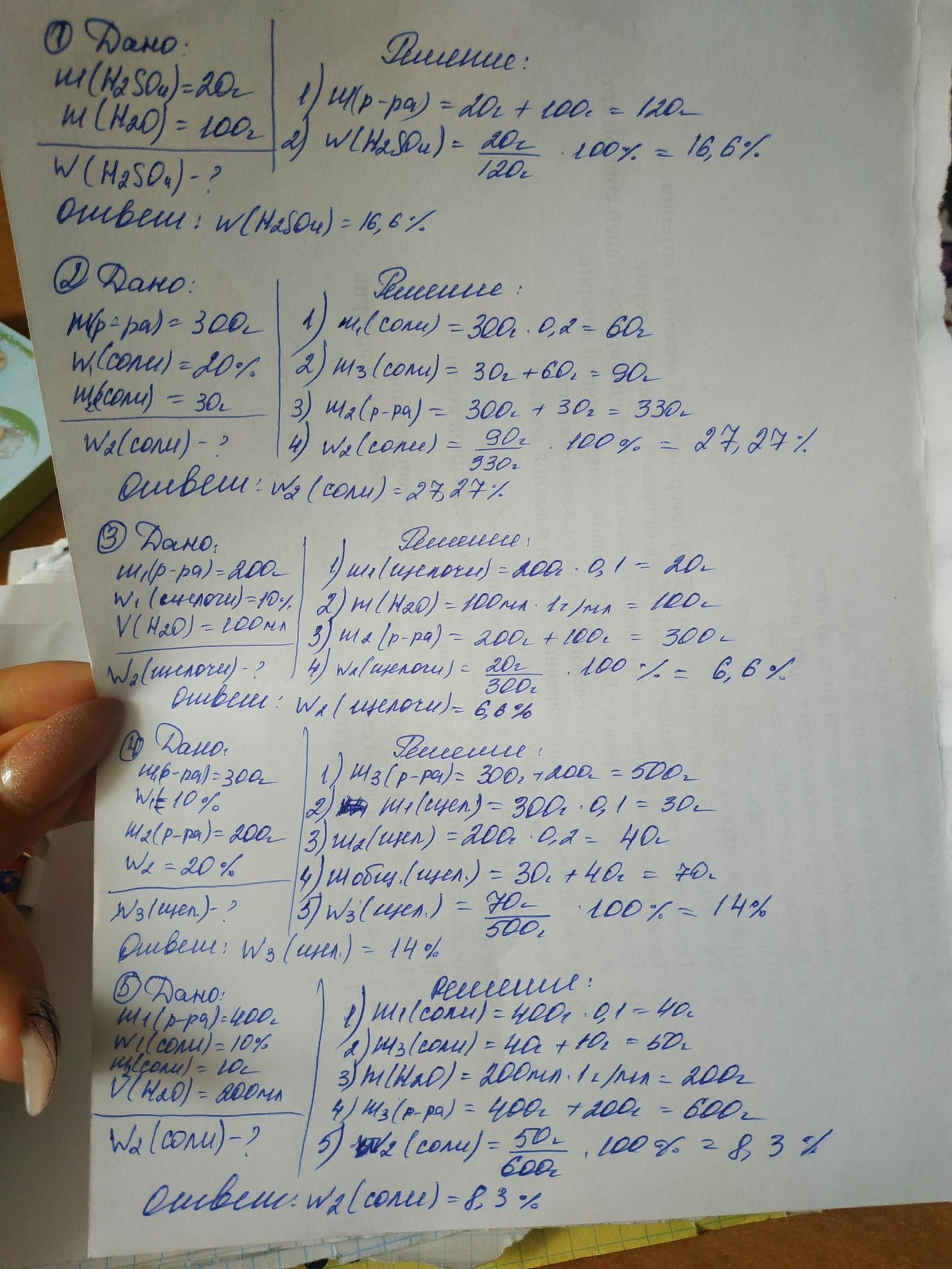 5. К 400г 10%-ного раствора добавили 10 г соли и 200 мл воды. Определить массовую