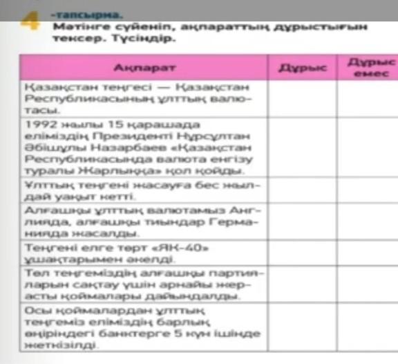 Жазылым.4-тапсырма. Мәтін мазмұны бойынша ақпараттың дұрыс, бұрыстығын анықта /3 балл/