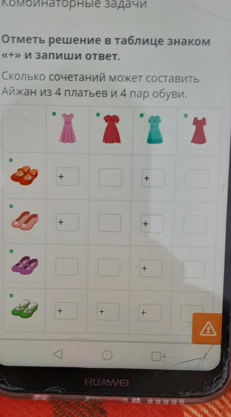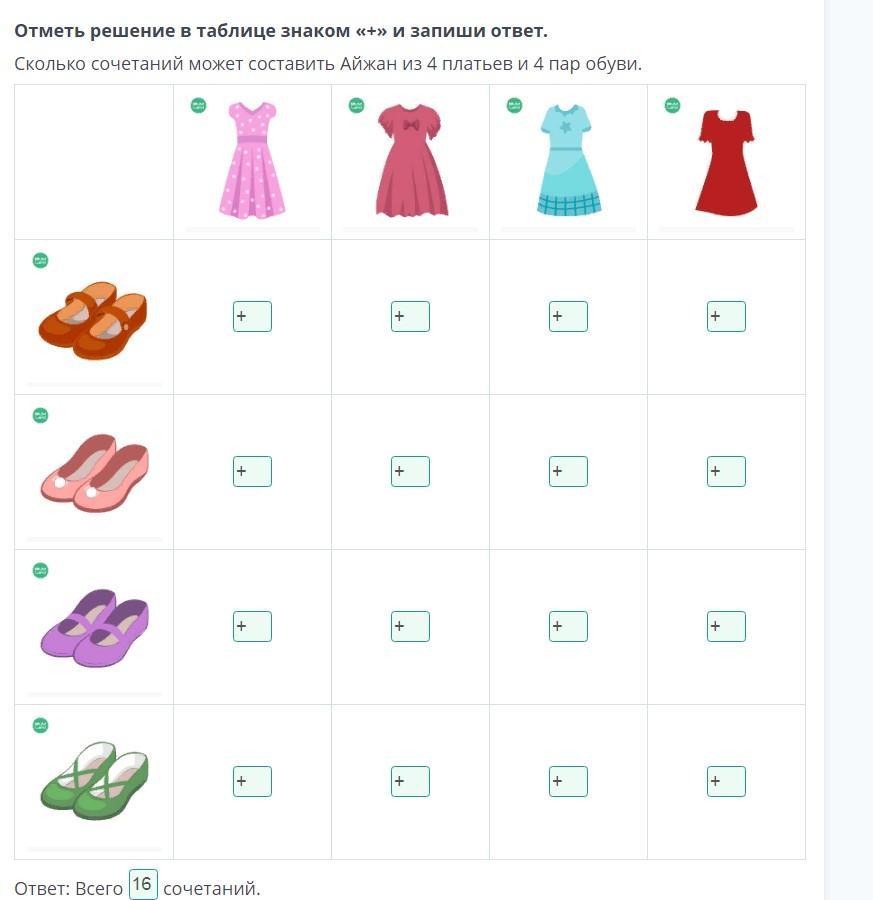 комбинаторные задачи Отметь решение в таблице знаком + сколько сочетаний может составить Аяжан из четырёх платьев и 4 пар обуви?