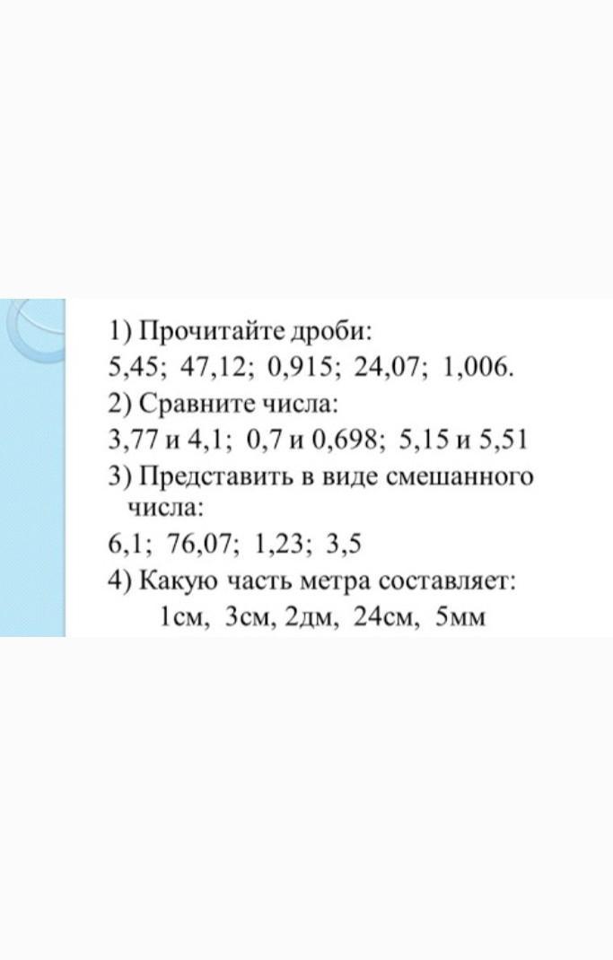 Ответ: 1) Пять целых сорок пять сотых; Сорок семь целых двенадцать сотых; Ноль целых девятьсот пятнадцать тысячных; Двадцать четыре целых семь сотых; Одна целая шесть тысячных.