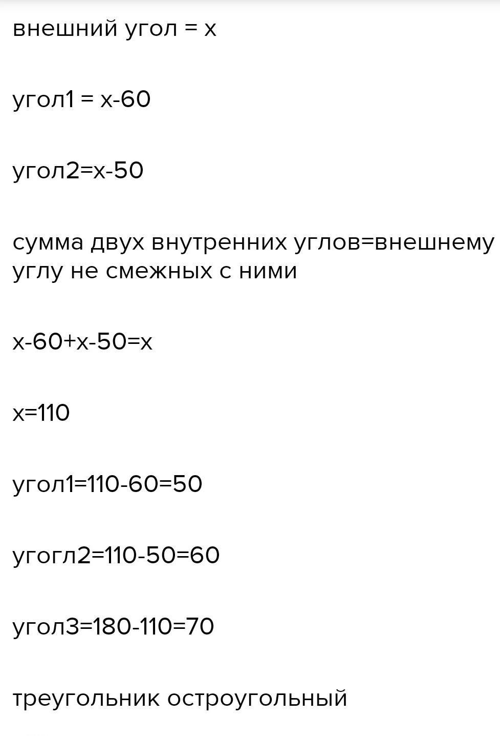 Задание 2. Внешний угол треугольника больше углов, не смежных с ним, соответственно на 60° и 50°. Является ли этот треугольник остроугольным?