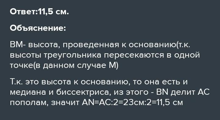 Высоты, проведённые к боковым сторонам AB и BC равнобедренного треугольника ABC, пересекаются в точке M. Прямая BM пересекает основание AC в точке N. Определи AN, если AC=43см.
