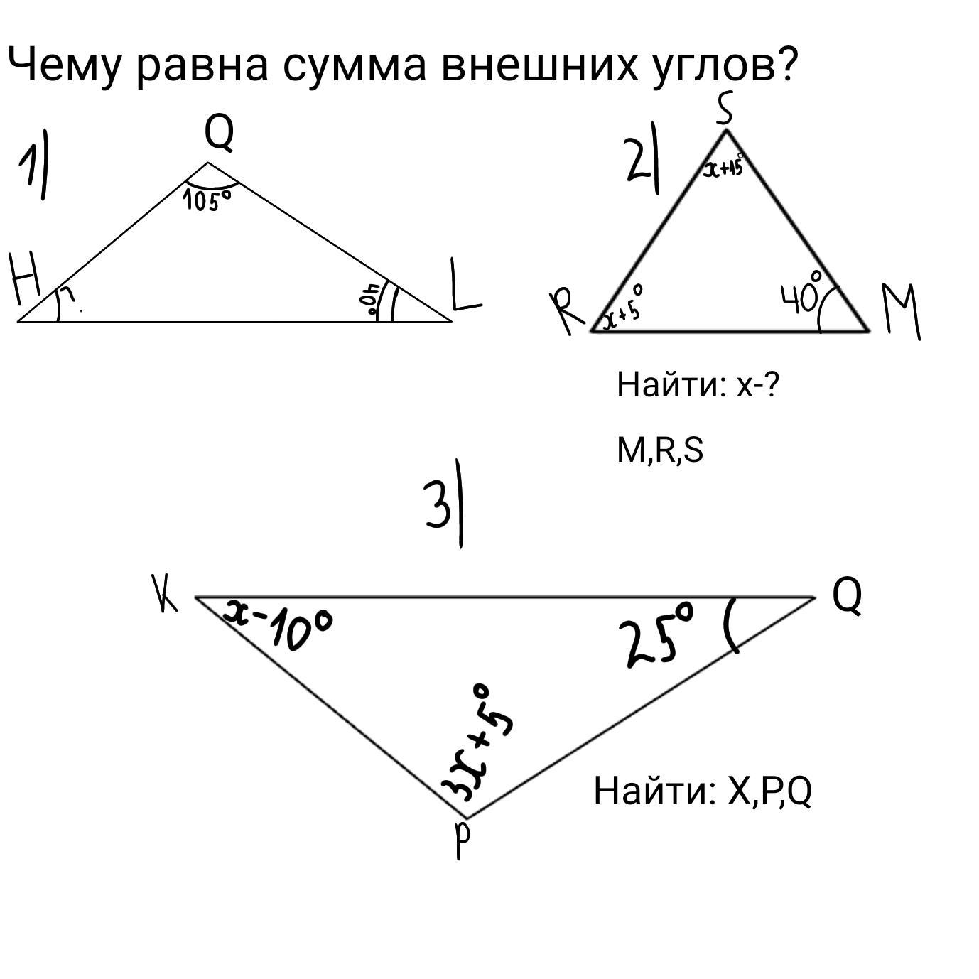 Ответ:1) H=135 Q=75 L=140 2) R=130 S=90 M=140 3) K=150 P=55 Q= 155 это внешние углы