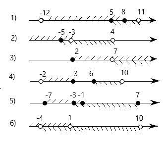 1) (-12; 11); 2) (-∞; 4); 3) [2; +∞); 4)(-2; 3] ∪ [6; 10); 5) [-7; 7]; 6) (-∞; 10)