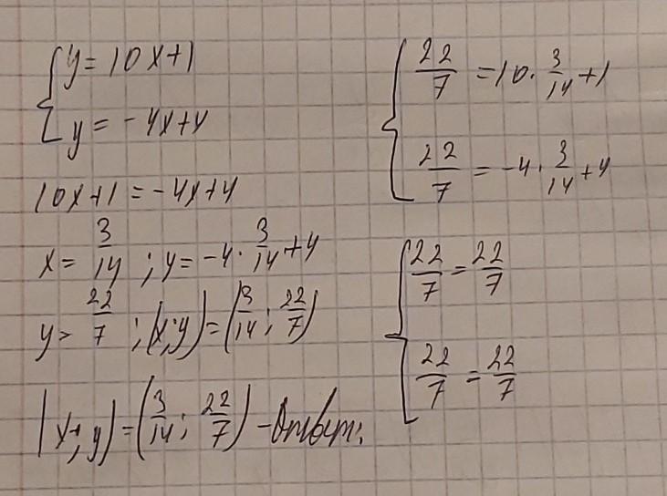 Сколько решений имеет система уравнений {y=10x+1y=−4x+4?