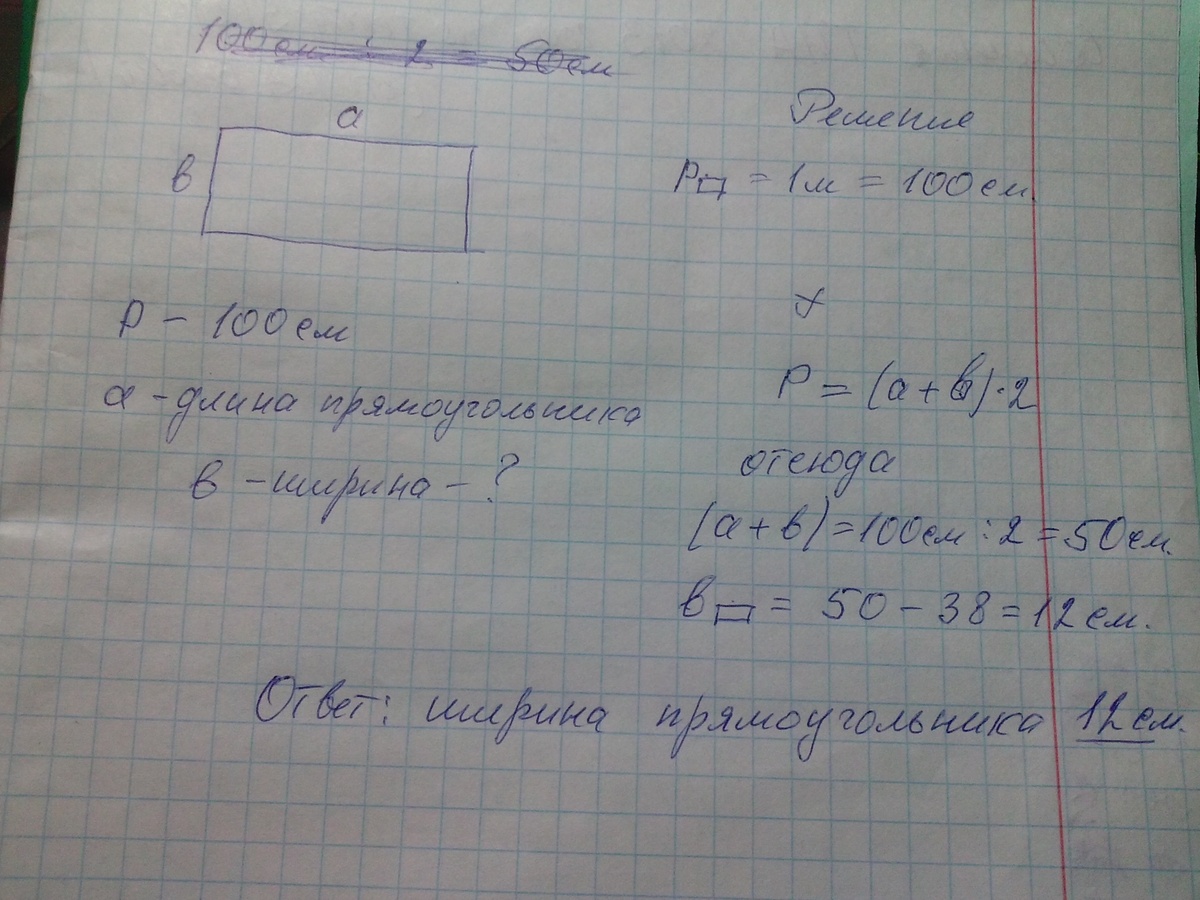 Периметр прямоугольника равен 1 м.Вычислить ширину прямоугольника,если длина его равна 38 см.Обьяснить решение