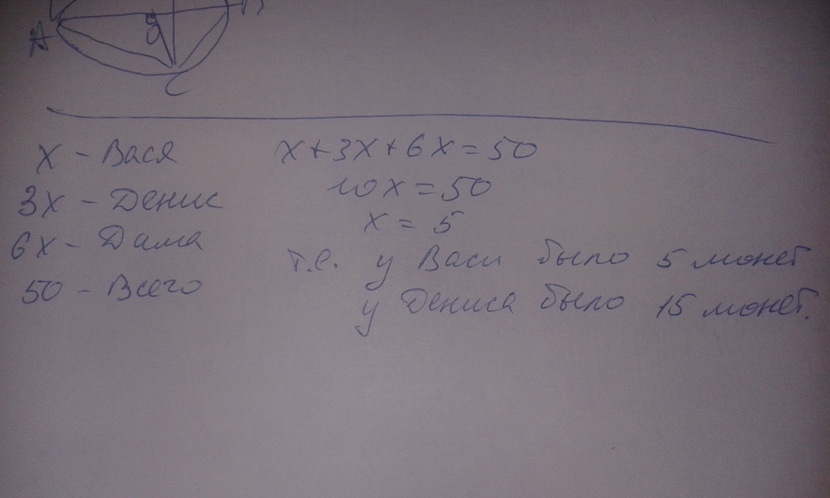 решите уравнением. У Дениса было в 3 раза больше монет, чем у Васи. А у Димы в 2 раза больше монет, чем у Дениса. Всего же монет было 50. Сколько монет было у васи? У Дениса.