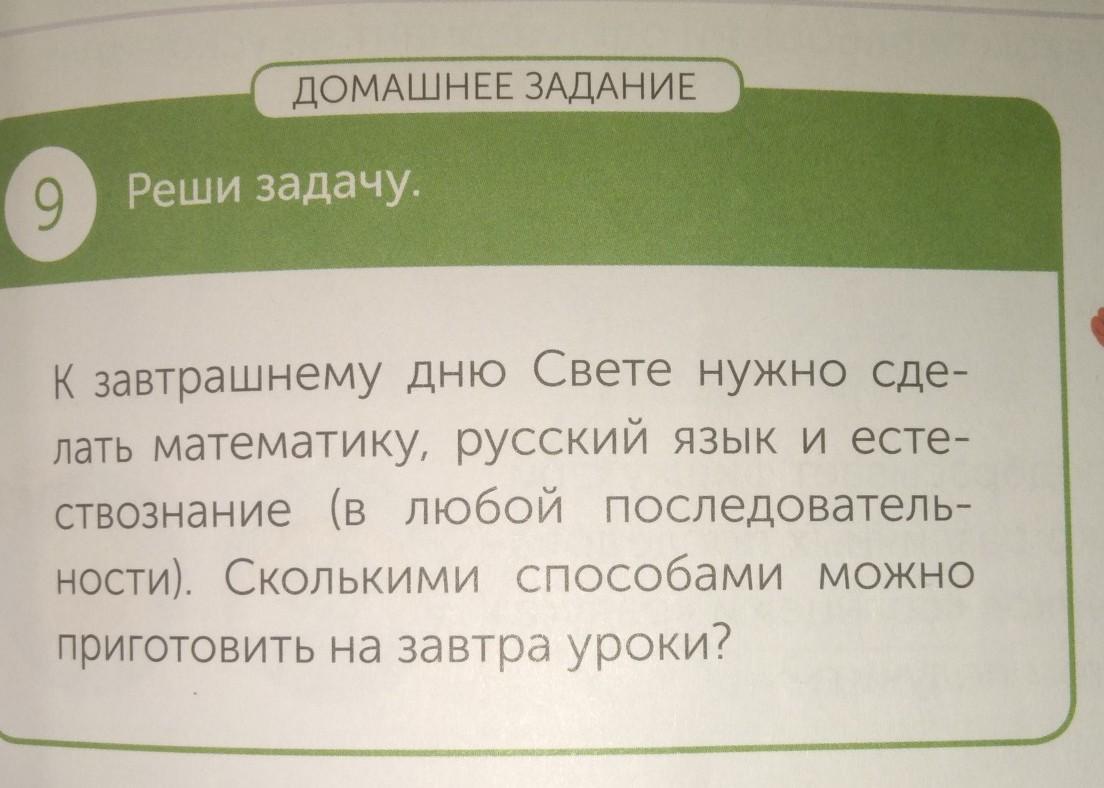 К завтрошнему дну Свете нужно сделать математику,русский язык и естествознания (в любой последовательности). Сколькими способами можно приготовит на завтра уроки?