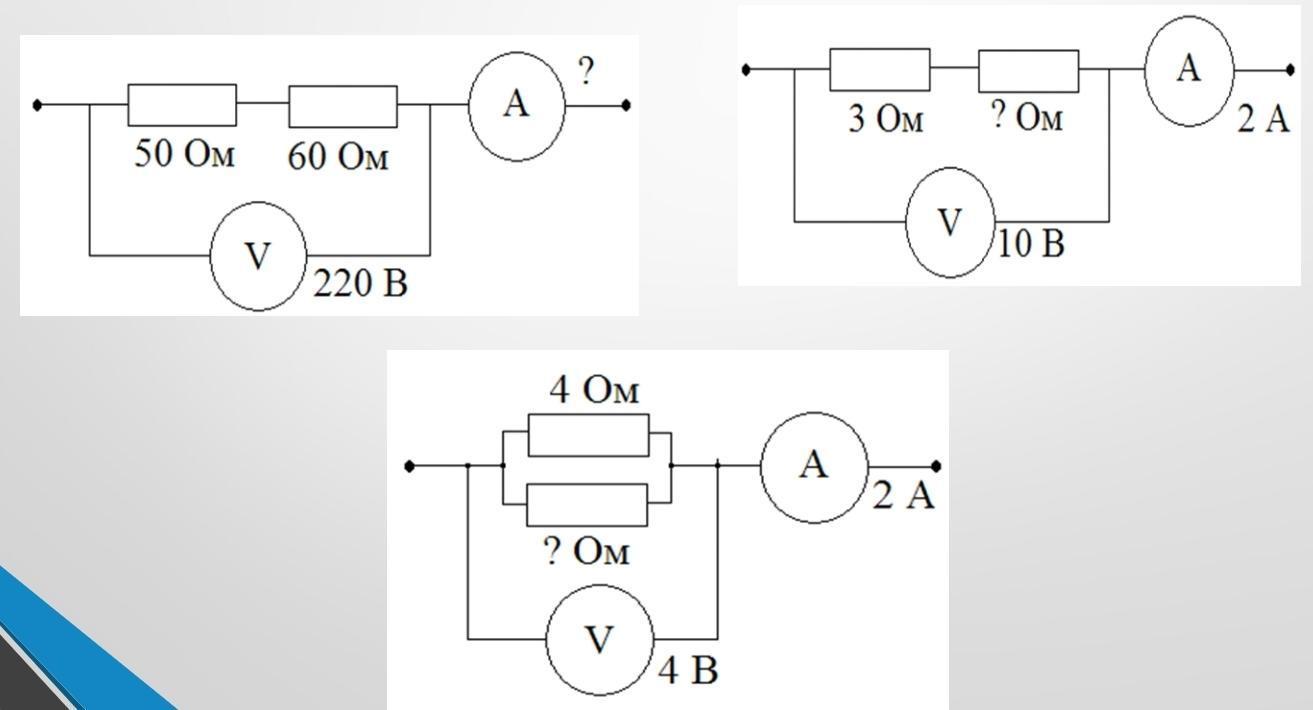 1, I=2A 2. R=2 Ом 3. R=4 Ом