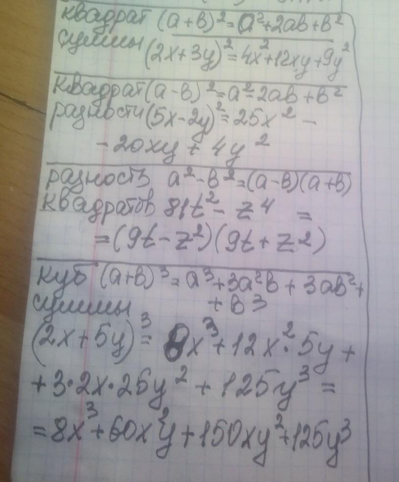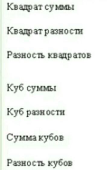 Нужно составить 7 примеров:Квадрат суммы, Квадрат разности, Разность квадратов, Куб суммы, Куб разности, Сумма кубов, Разность кубов. Нужно сделать с переменными. Даю 50 баллов