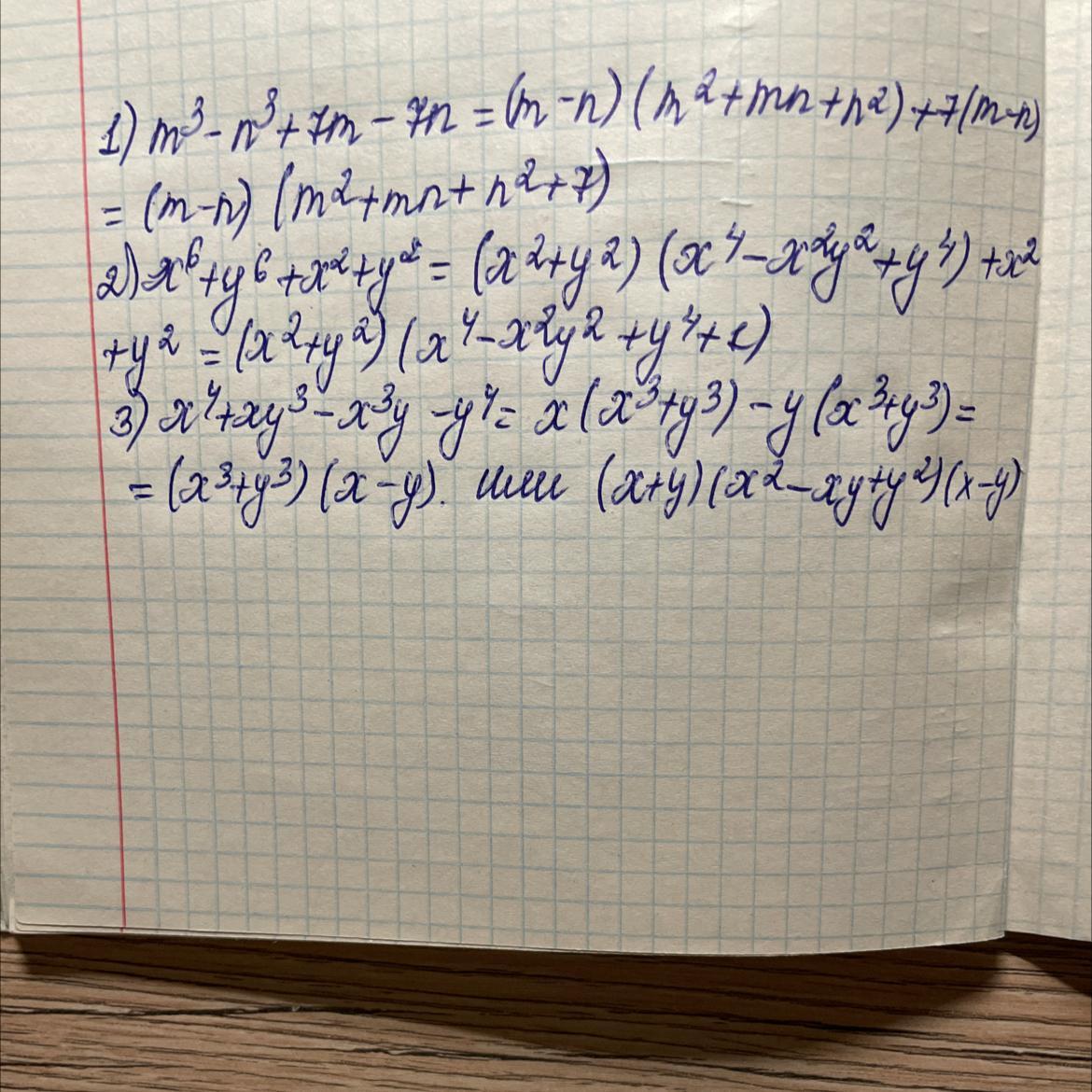 1) m^3 - n^3 + 7m - 7n = (m-n)*(m^2+mn+n^2) + 7*(m-n) = (m-n) * (m^2+mn+n^2+7)