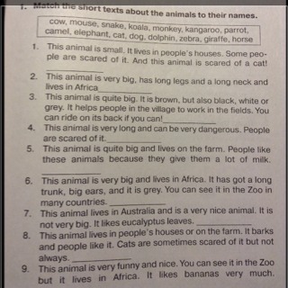 1 mouse 2 giraffe 3 horse 4 snake 5 cow 6 elephant 7 koala 8 dog 9 monkey 10 zebra 11 dolphin 12 parrot 13 cat 14 camel 15 kangaroo