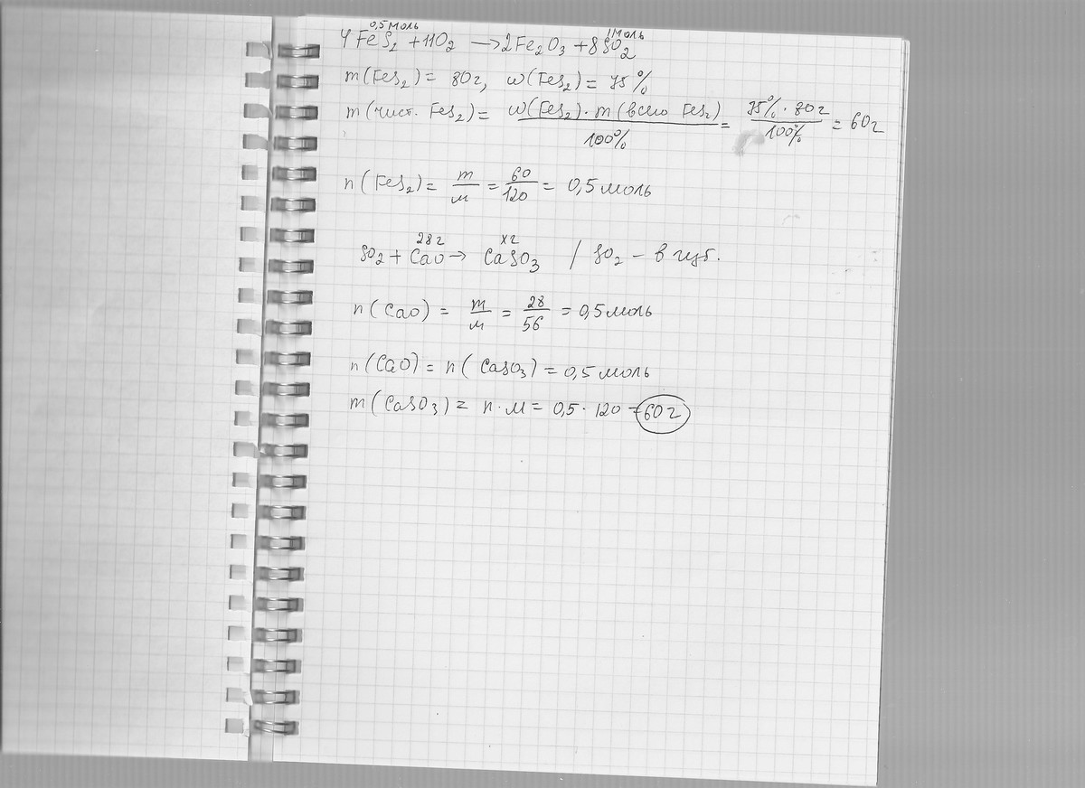 сульфур(4)оксид,образовавшийся в результате обжигания железного калчадана массой 80 г,который содержит 25% примесей,реагирует с кальций(2) оксидом массой 28 г.определить массу полученной соли.