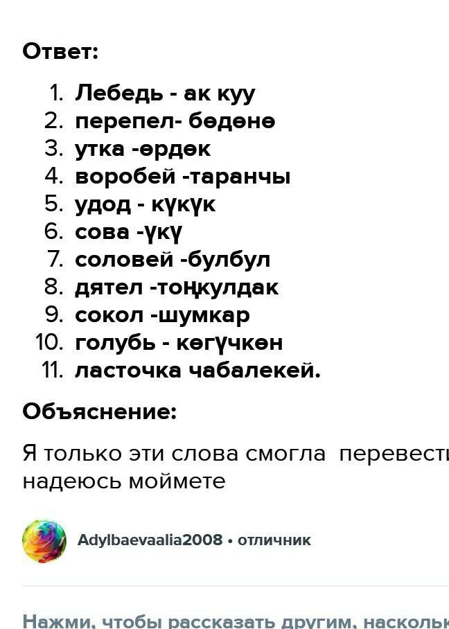 Биринчи тапшырма: Канаттуулардын аталыштары менен мүнөздөмөсүн дал келтиргиле. 1)Бул канаттуу өрөөндөрдө гана кездешет. Айылдарга, айыл четиндеги фермаларга жакын топ- топ болуп жашайт. Дан эгиндерине зыян келтирүүчү курт- кумурскаларды жеп пайда алып келет. Ошондуктан адамдар ага атайын жыгачтан уя жасап, илип коюшат. 2) " Бытпылдык" деп үн салчу анча чоң эмес канаттуу. Көбунчө дан эгин айдалган талааларда жашайт. Жашоосунун көбү асманда эмес жерде өткөндүктөн ,душманынан чуркап качып кутулат. Өсүмдүктөрдүн уругун, курт- кумурскаларды жейт . 3) Бул канаттуу "үп-үп"деп үн салат. Тумшугу узун,ичке,ал эми тили кыска. Курт- кумурскалар жана курттар менен азыктанат. Жазда учуп келет. 4) Бул канаттуу зоолордо жашайт. Колдогусу 40-45 жашка, жапайысы 100-гө чыкат. Буту ич жагына ийри, көзү ак, канатынын мөрүсү калың, буту ичке, балтырына тутам батпайт. Канаттуулар: Бөдөнө, Үпүп, Бүркүт, Чыйырчык. Экинчи тапшырма: Сөздөрдү пайдаланып, сөздөрдүн котормосун туура жазгыла. Куштардын аталыштары: Үкү, ак куу, шумкар, турумтай,каракур, булдурук, таранчы, кыргый, өрдөк, үпүп, бөдөнө, чыйырчык, булбул, чил, ылаачын, торгой,күйкө, томого, күкүк, тоңкулдак, чабалекей, көгүчкөн, каз, күрп, турна. Сөздөрдүн котормолору: Лебедь, кречет, перепел,скворец, тетерев, утка, рябчик, воробей, удод, сова.ястреб, журавль,кукушка, соловей, дятел, дербник, кукушка, гусь, сокол, индюк, жаворонок, пустельга, наглазник, голубь, ласточка.