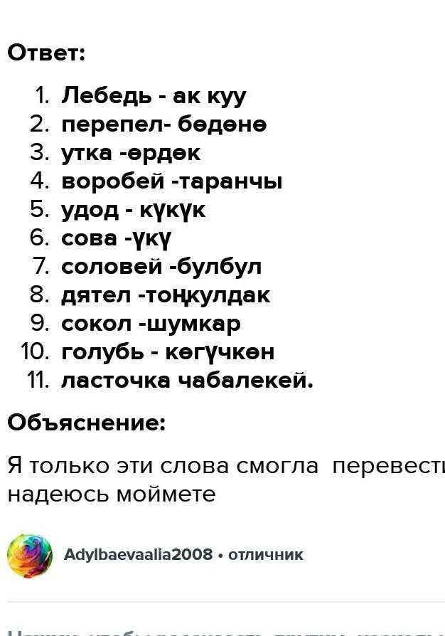 Биринчи тапшырма: Канаттуулардын аталыштары менен мүнөздөмөсүн дал келтиргиле. 1)Бул канаттуу өрөөндөрдө гана кездешет. Айылдарга, айыл четиндеги фермаларга жакын топ- топ болуп жашайт. Дан эгиндерине зыян келтирүүчү курт- кумурскаларды жеп пайда алып келет. Ошондуктан адамдар ага атайын жыгачтан уя жасап, илип коюшат. 2) " Бытпылдык" деп үн салчу анча чоң эмес канаттуу. Көбунчө дан эгин айдалган талааларда жашайт. Жашоосунун көбү асманда эмес жерде өткөндүктөн ,душманынан чуркап качып кутулат. Өсүмдүктөрдүн уругун, курт- кумурскаларды жейт . 3) Бул канаттуу "үп-үп"деп үн салат. Тумшугу узун,ичке,ал эми тили кыска. Курт- кумурскалар жана курттар менен азыктанат. Жазда учуп келет. 4) Бул канаттуу зоолордо жашайт. Колдогусу 40-45 жашка, жапайысы 100-гө чыкат. Буту ич жагына ийри, көзү ак, канатынын мөрүсү калың, буту ичке, балтырына тутам батпайт. Канаттуулар: Бөдөнө, Үпүп, Бүркүт, Чыйырчык. Экинчи тапшырма: Сөздөрдү пайдаланып, сөздөрдүн котормосун туура жазгыла. Куштардын аталыштары: Үкү, ак куу, шумкар, турумтай,каракур, булдурук, таранчы, кыргый, өрдөк, үпүп, бөдөнө, чыйырчык, булбул, чил, ылаачын, торгой,күйкө, томого, күкүк, тоңкулдак, чабалекей, көгүчкөн, каз, күрп, турна. Сөздөрдүн котормолору: Лебедь, кречет, перепел,скворец, тетерев, утка, рябчик, воробей, удод, сова.ястреб, журавль,кукушка, соловей, дятел, дербник, кукушка, гусь, сокол, индюк, жаворонок, пустельга, наглазник, голубь, ласточка.